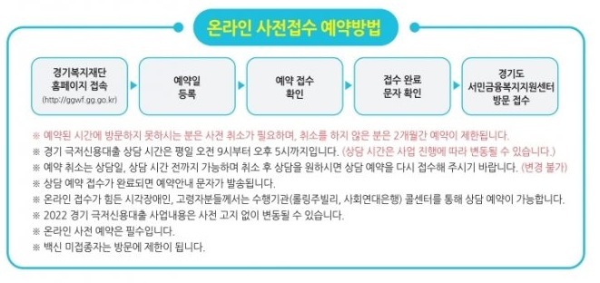 온라인 예약 (경기복지재단 홈페이지) → 제출 서류 준비 (본인) → 경기도 서민금융복지지원센터 접수(본인) → 대출심사 (수행기관) → 대출실행 (수행기관)
