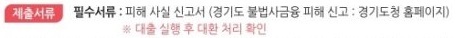 피해 신고 접수 (경기도청 홈페이지 - 경기도 불법 사금융 피해 신고센터) → 상담 → 대출 접수 (본인) → 대출 심사 대출 실행 (수행기관)