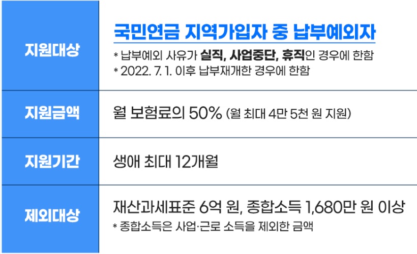 이러한 문제를 해결하기 위해, 국민연금공단은 저소득 지역납부예외자 중 연금보험료를 다시 납부하려는 분들에게 보험료 일부를 지원하는 제도를 운영하고 있습니다 이를 통해 연금 사각지대를 해소하고, 노후소득보장을 강화하는 역할을 하고 있습니다.